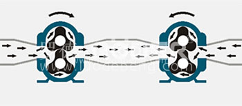 凸輪轉子泵屬于容積泵,有兩個相向旋轉的轉子安裝于平行的同步齒輪軸上,轉子與泵殼之間不斷形成小的腔體,填充在腔體內(nèi)的介質不斷被旋轉的轉子由進口端推到出口端。